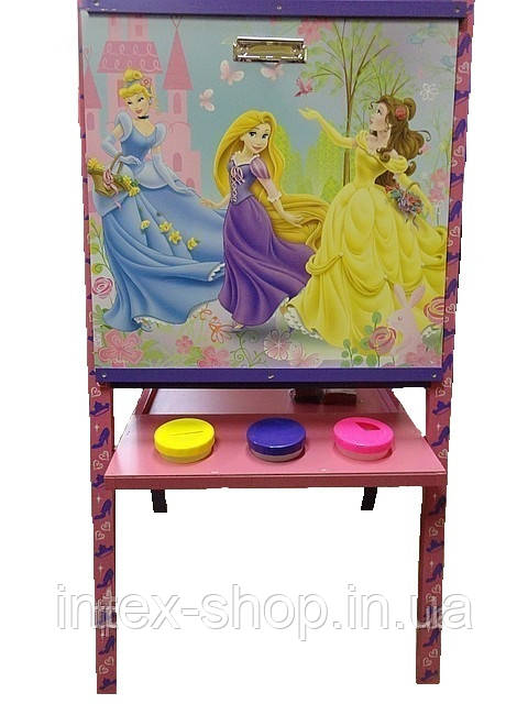Для юної принцеси можна, наприклад, вибрати оформлення «Принцеси». Вся конструкція виготовлена з нетоксичних матеріалів, тому цей дитячий мольберт нешкідливий для здоров'я. Дошка для художників має одну сторону темного кольору, з грифельною поверхнею, яка призначена для творчості дитини різнобарвними крейдами. Друга сторона — біла та магнітна дошка. На ній дитина зможе малювати фломастерами, а також її можна використовувати для вивчення алфавіту та математики, використовуючи магнітні літери та цифри. Вони завжди під рукою, їх можна складати в підвісну поличку знизу дошки.